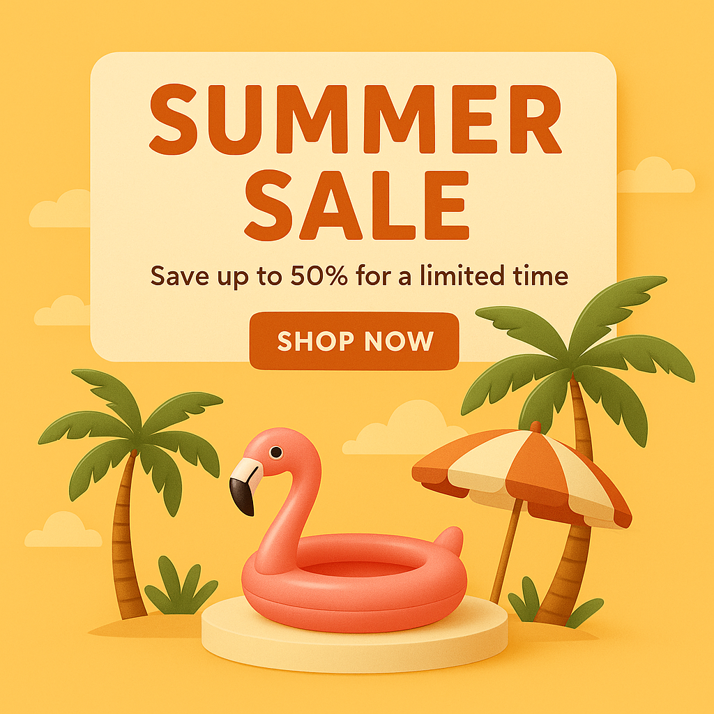 /Collection: /by davooda/Type: PNG/A cheerful summer sale design featuring a pink flamingo inflatable pool, palm trees, and a beach umbrella against a bright yellow background. The promotional text invites shoppers to take advantage of limited-time savings.