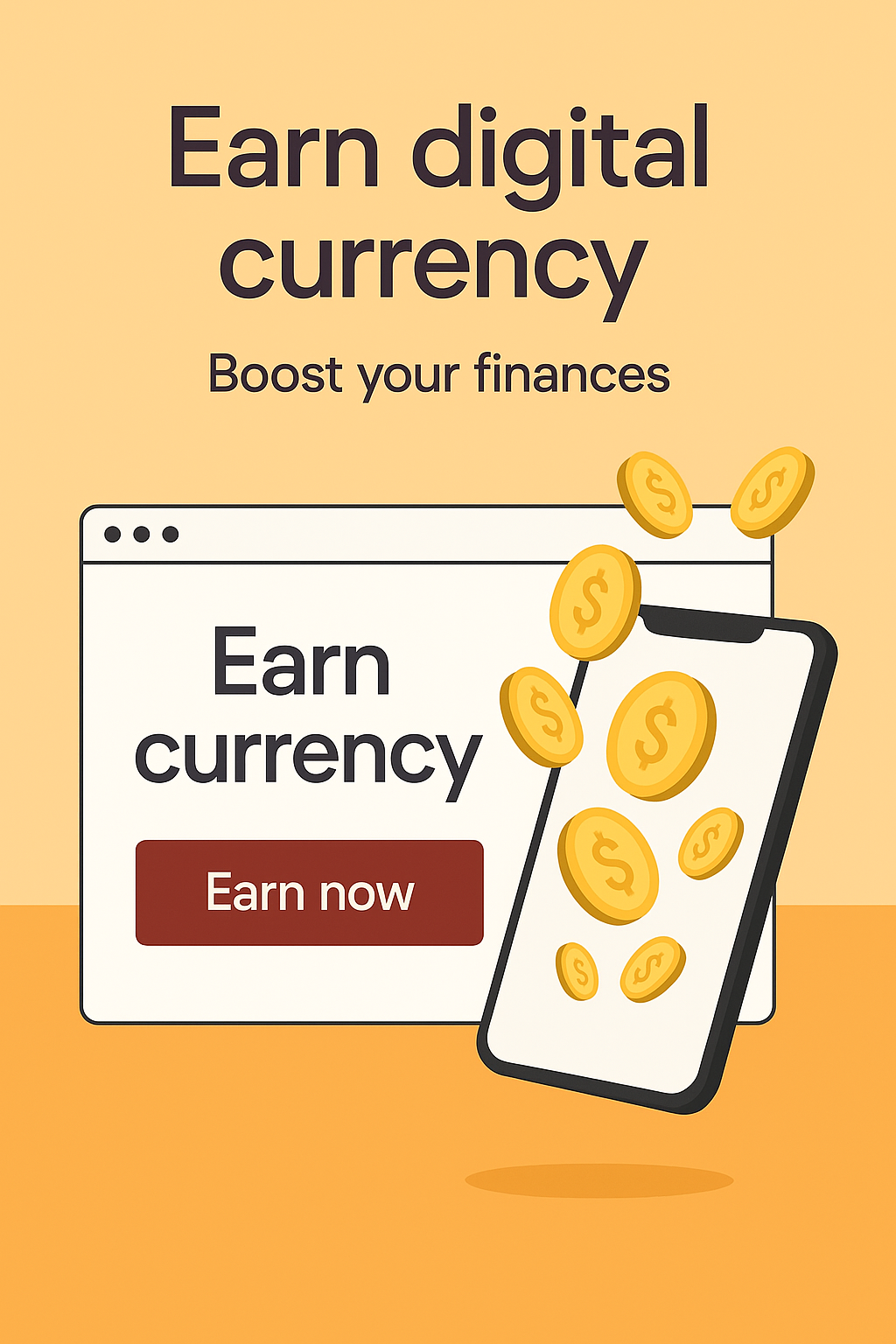 /Collection: /by davooda/Type: PNG/Promotional graphic featuring a mobile phone and coins, aimed at encouraging users to earn digital currency. The design is modern and vibrant, suitable for financial websites or apps.
