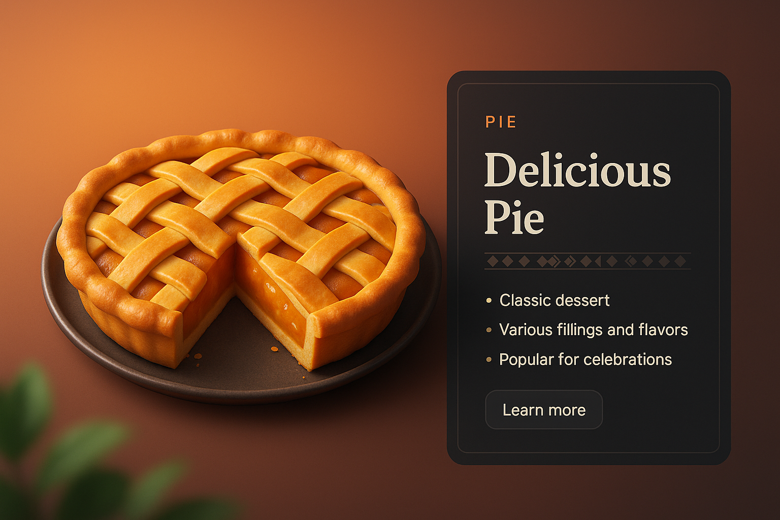 A beautifully rendered 3D pie illustration sits on a plate, accompanied by a sleek dark overlay featuring descriptive text and interactive elements, creating a modern design.