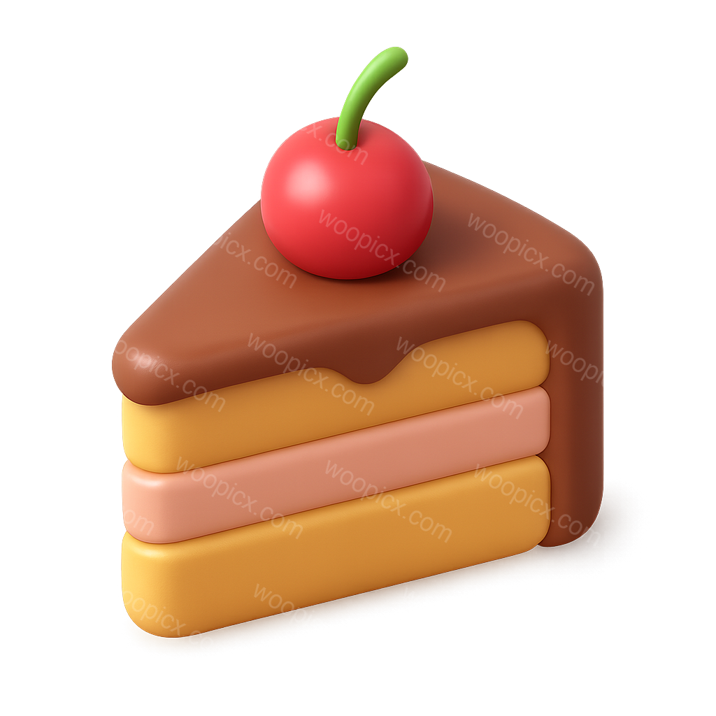 A visually appealing 3D icon of a slice of cake featuring layers of yellow, pink, and brown topped with a red cherry, set against a soft gradient background.