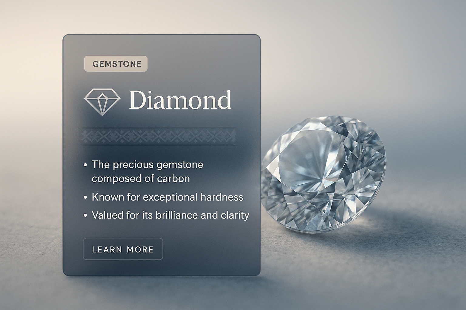 A stunning diamond is showcased alongside an informative overlay, featuring the gem's qualities. The design combines clarity and elegance with a smooth gradient background.