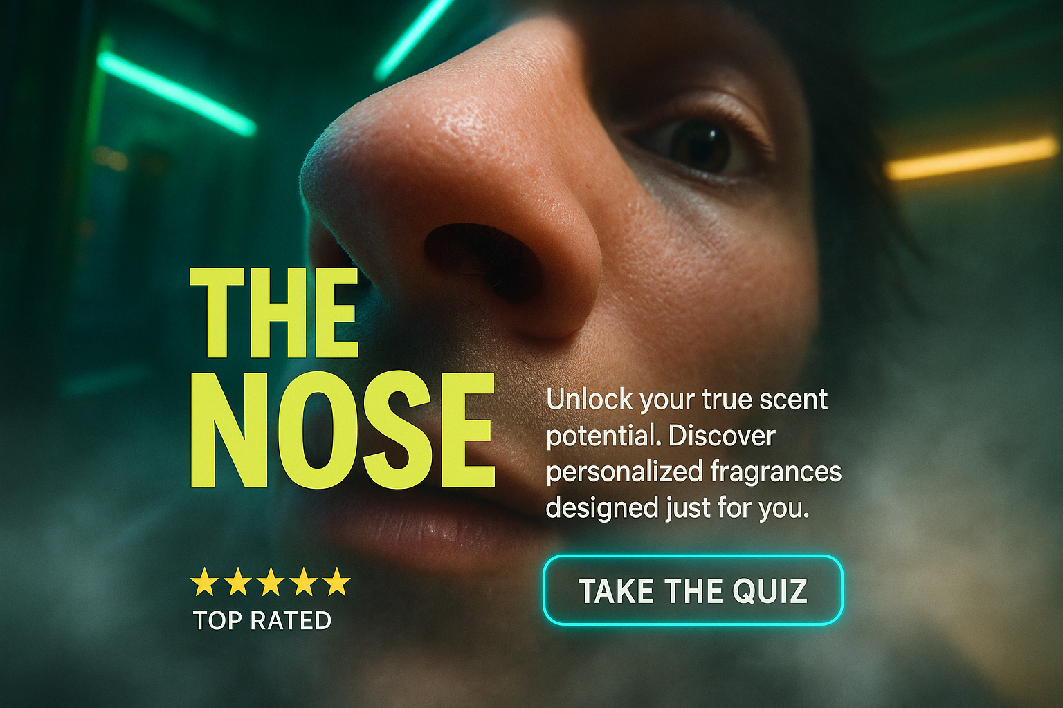 A vibrant carousel slide showcasing a close-up of a nose with neon accents and foggy background. Engaging text invites users to discover personalized fragrances.