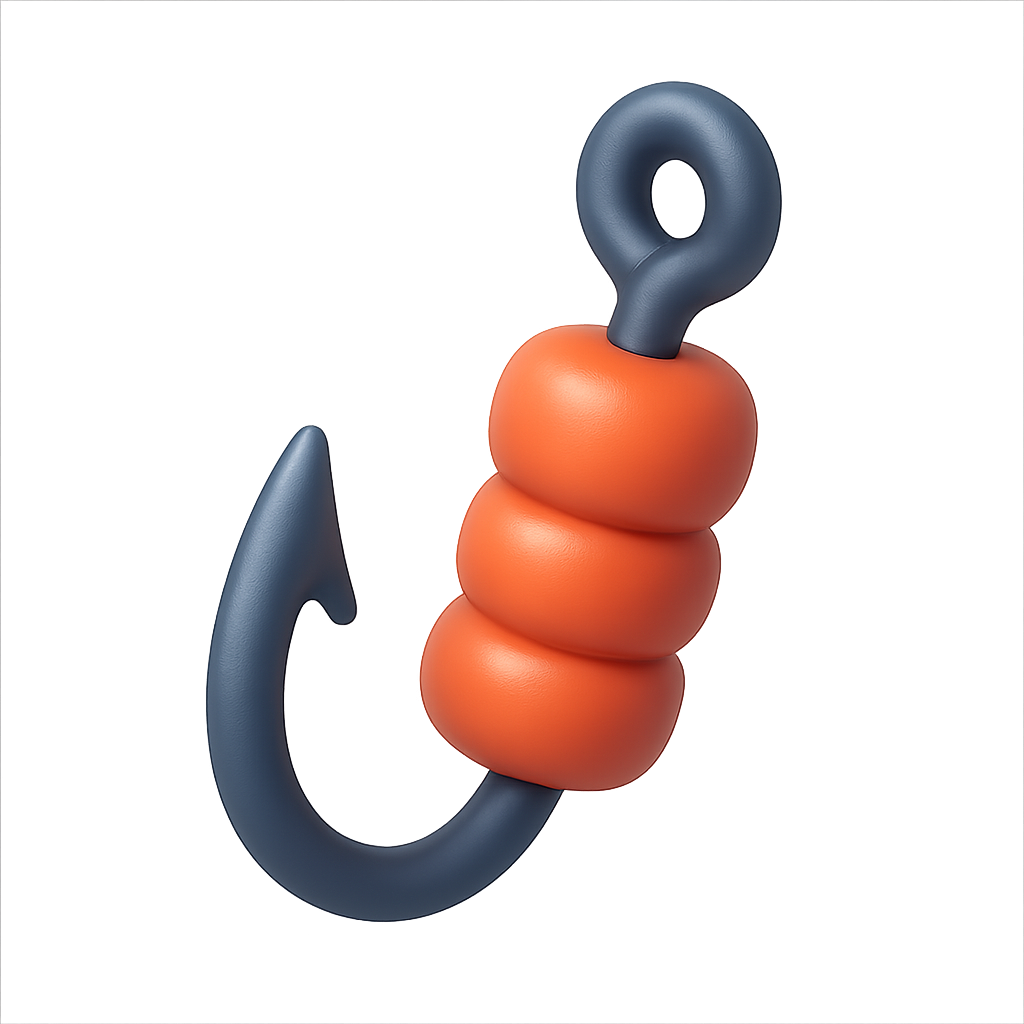 This image features a sleek 3D bait icon designed in a three-quarter view, showcasing a vibrant orange and blue color scheme with a glossy finish.