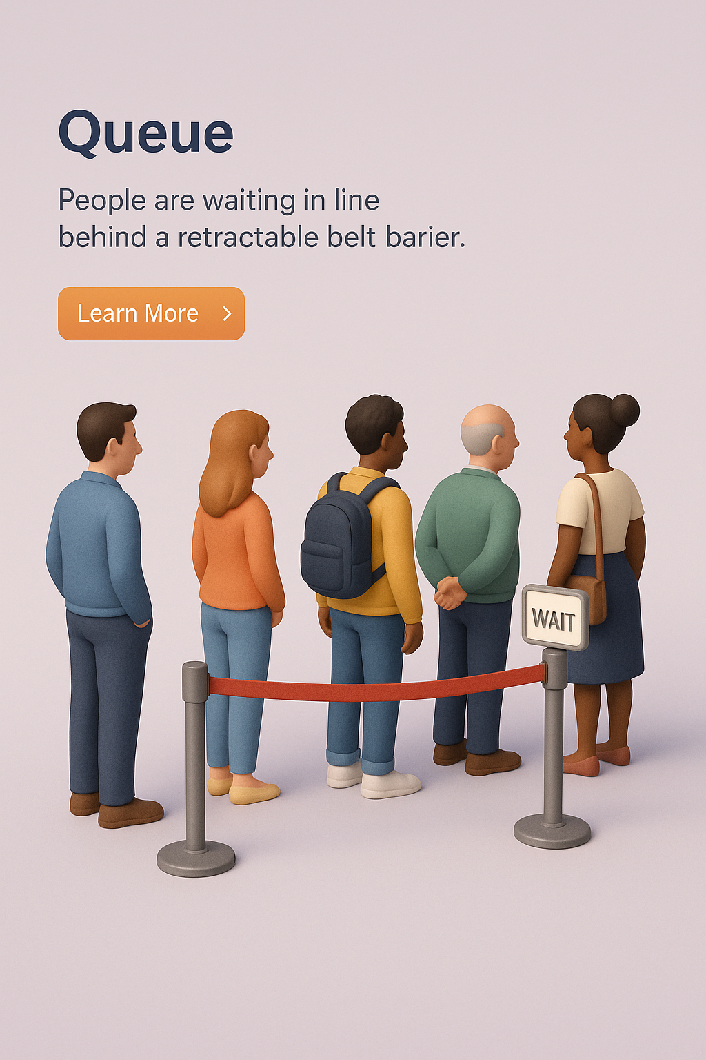 /Collection: /by davooda/Type: PNG/A detailed 3D illustration depicting a queue of diverse individuals waiting in line behind a retractable barrier. The scene is zoomed out, showing the full context with readable text elements.