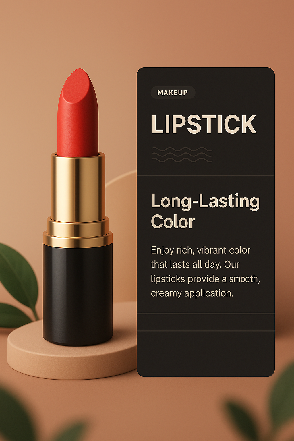 /Collection: /by davooda/Type: PNG/A 3D illustration of a vibrant red lipstick on a soft gradient background, accompanied by a dark information block detailing its long-lasting color and application benefits.
