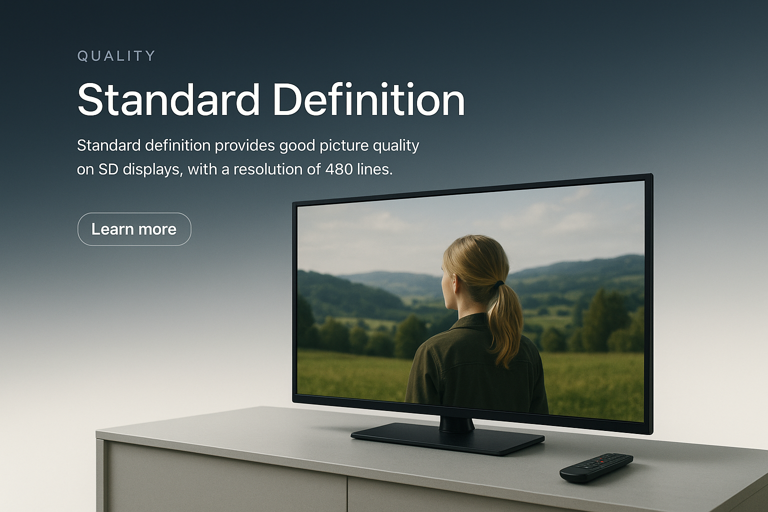 A sleek web page design showcasing a television displaying a landscape and a person. The layout features a gradient background, clear text, and an action button, enhancing readability.