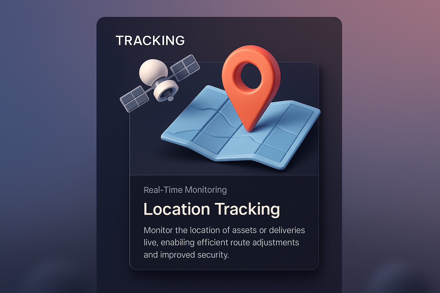 /Collection: /by davooda/Type: PNG/A visually striking 3D illustration depicting a web page focused on location tracking. Features a dark panel with a map and satellite icon, emphasizing real-time monitoring.