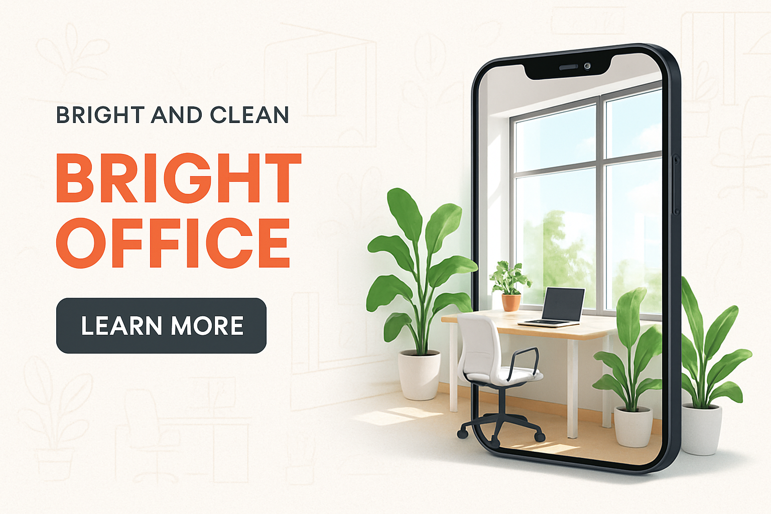 /Collection: /by davooda/Type: PNG/A modern advertisement showcasing a bright office environment with green plants and large windows. The design features a smartphone displaying a vibrant workspace, complemented by bold typography.