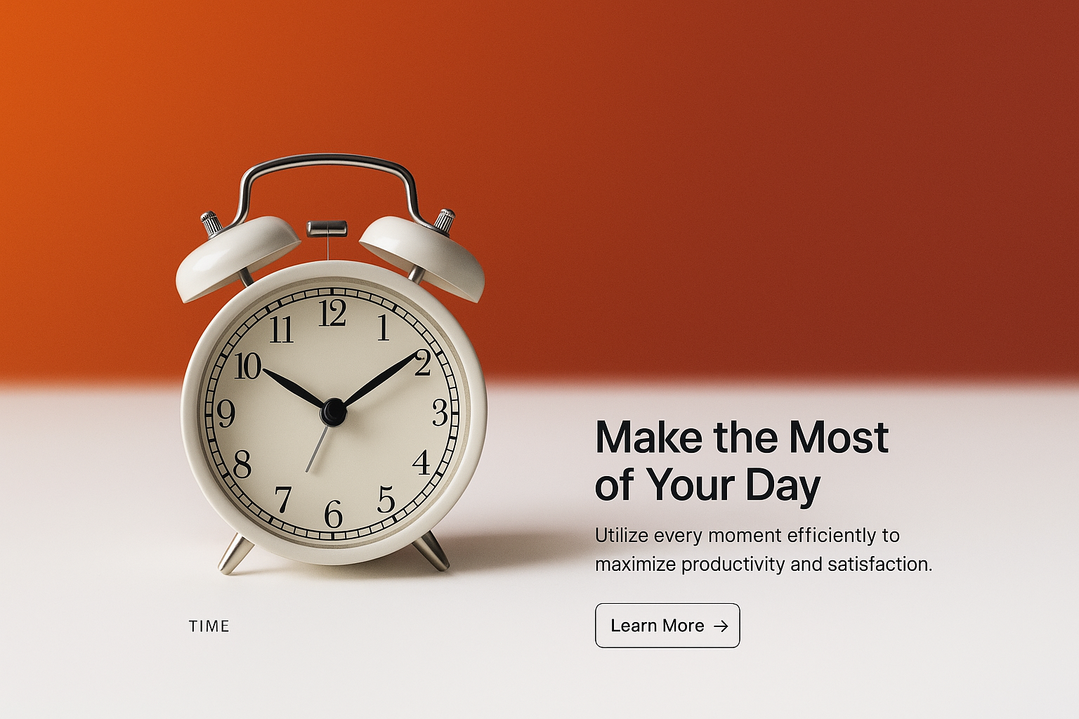 A visually appealing web design featuring an alarm clock against a gradient background. The page includes a small label, a concise header, and a text block with a call-to-action button.
