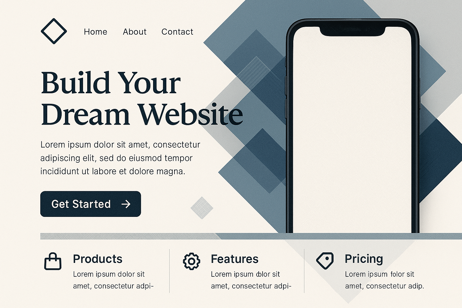 /Collection: /by davooda/Type: PNG/This image showcases a dynamic landing page design featuring a smartphone mockup, geometric shapes, and clear call-to-action buttons, all with a minimalist aesthetic.