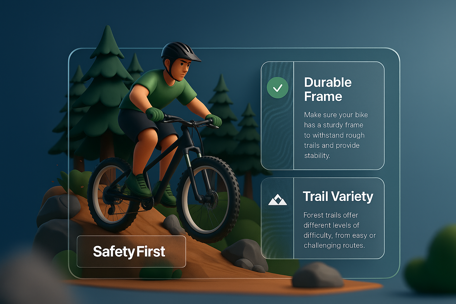 A dynamic 3D illustration of a man mountain biking through a lush forest. The scene features a sturdy bike and a vibrant forest backdrop, emphasizing adventure and outdoor activity.