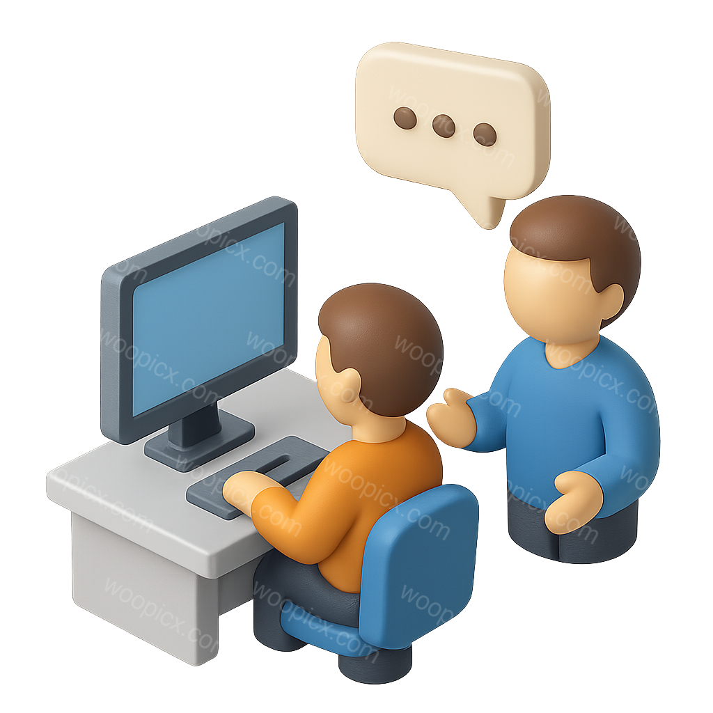 /Premium/Collection: /by davooda/Type: PNG/A 3D isometric icon depicting two characters engaged in conversation, with one seated at a computer. The design features a transparent background and a volumetric style.