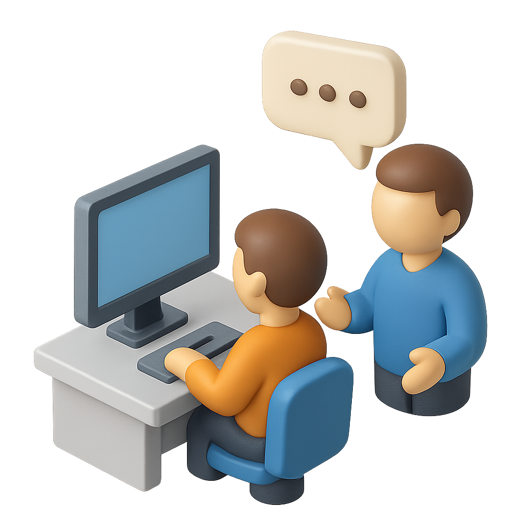 /Collection: /by davooda/Type: PNG/A 3D isometric icon depicting two characters engaged in conversation, with one seated at a computer. The design features a transparent background and a volumetric style.
