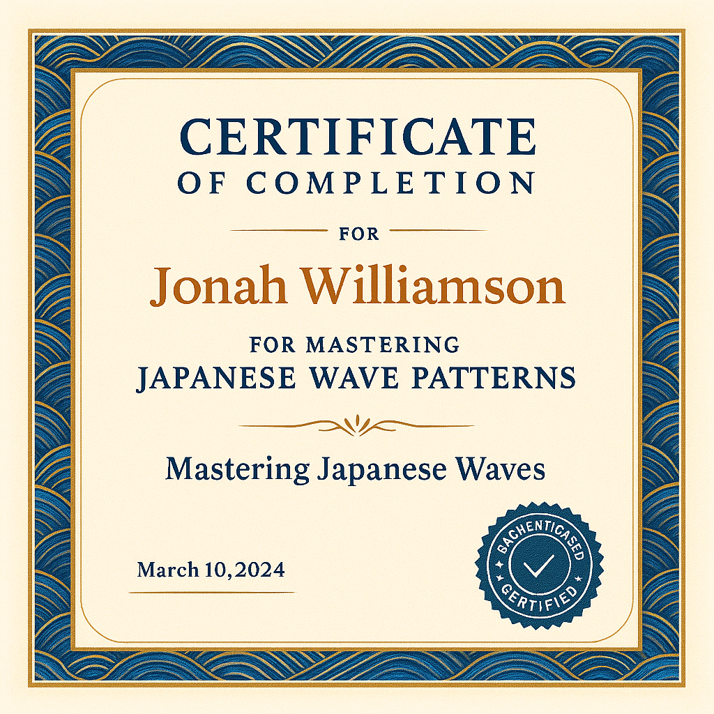/Collection: /by davooda/Type: PNG/A beautifully designed certificate featuring traditional Japanese wave patterns, ideal for educational achievements or course completions. The layout is clean and professional, suitable for framing or digital sharing.