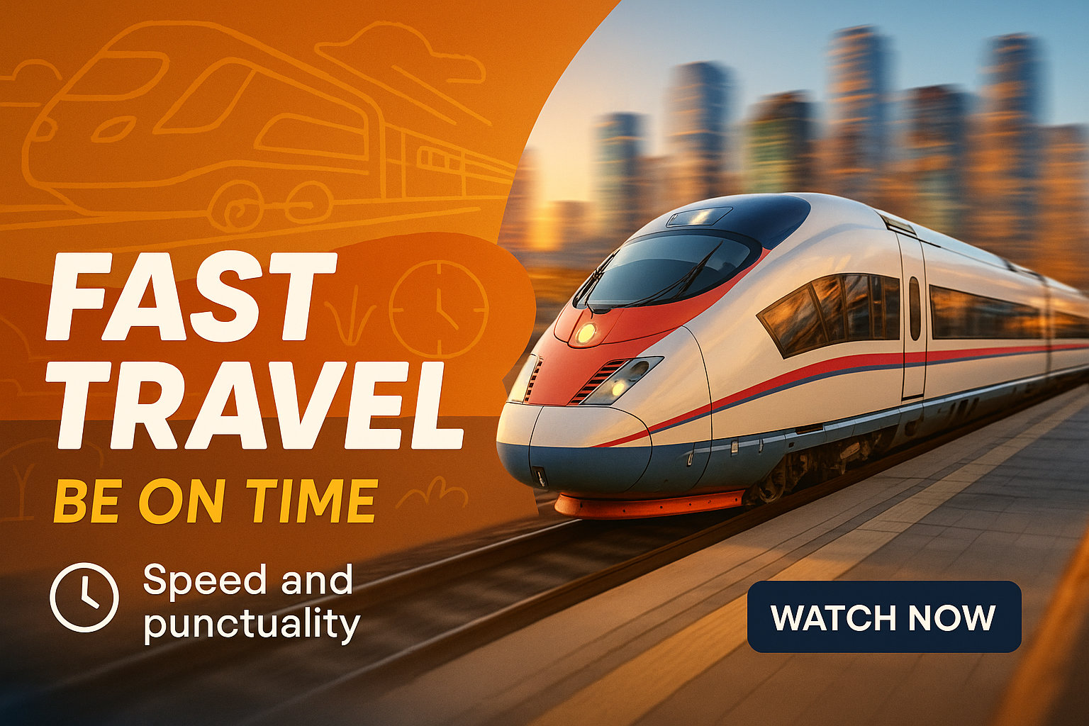 Vibrant promotional image showcasing a high-speed train in a cityscape, emphasizing speed and punctuality. Ideal for travel service marketing campaigns.