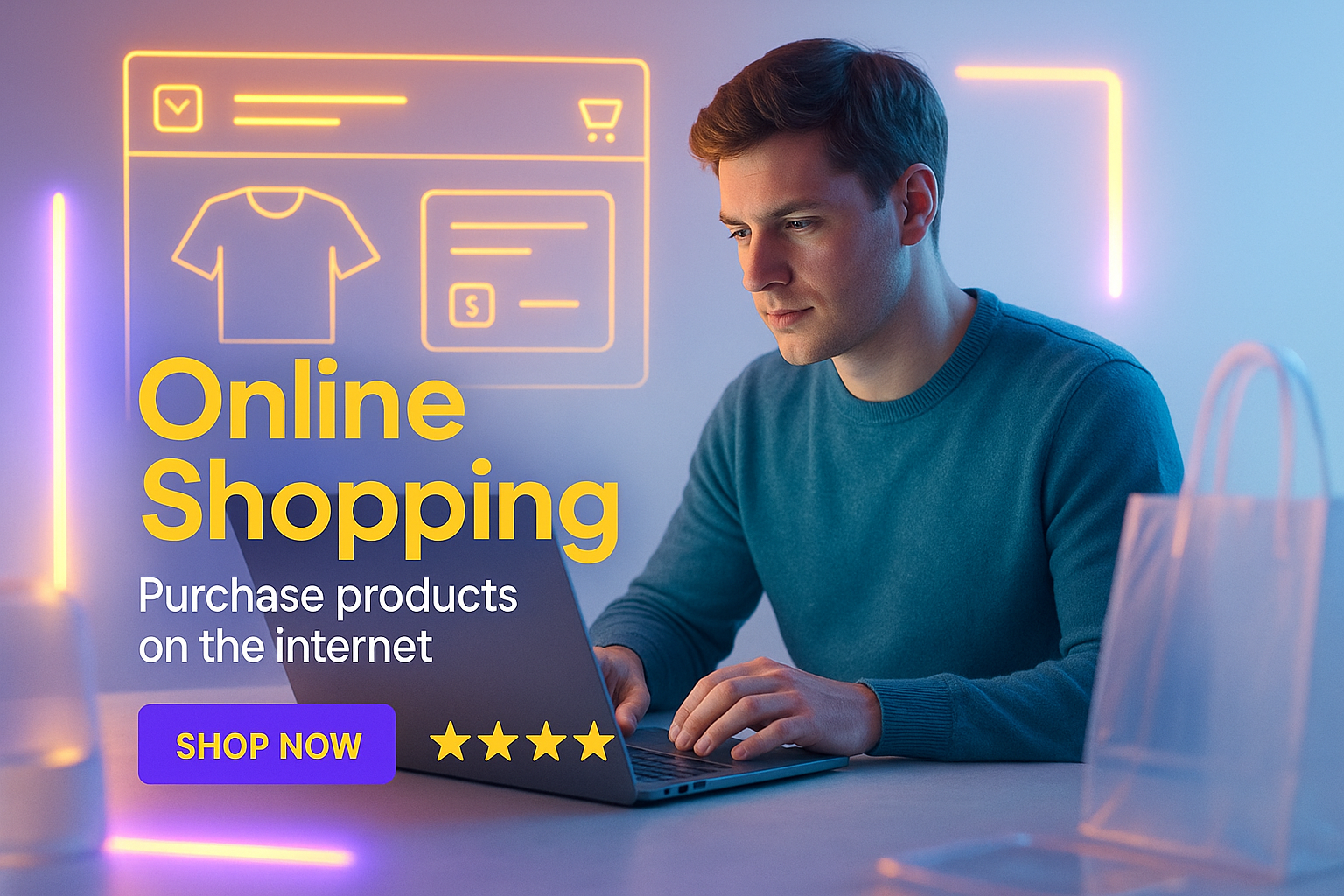 /Collection: /by davooda/Type: PNG/Engaging online shopping promotional banner featuring a young man using a laptop, with neon graphics that enhance the tech-savvy theme, ideal for e-commerce advertising.