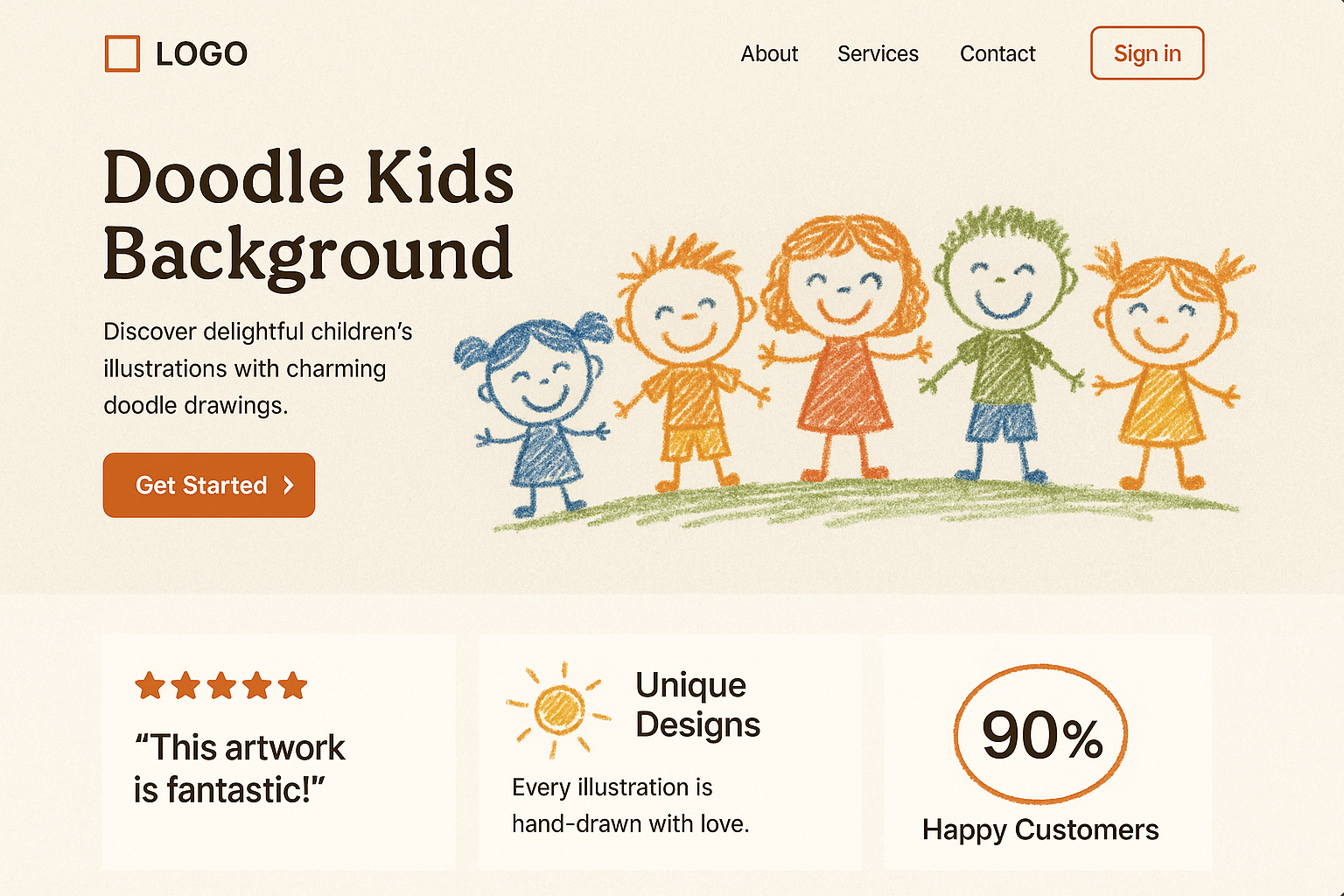 /Collection: /by davooda/Type: PNG/A minimalist landing page design showcasing charming doodle illustrations of children. Features a logo, navigation menu, call-to-action buttons, and customer testimonials.
