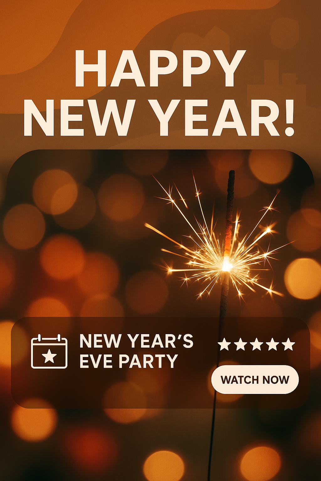 /Collection: /by davooda/Type: PNG/A vibrant social media post promoting a New Year's Eve party, featuring a sparker against a bokeh background. Ideal for engaging audiences for holiday celebrations.