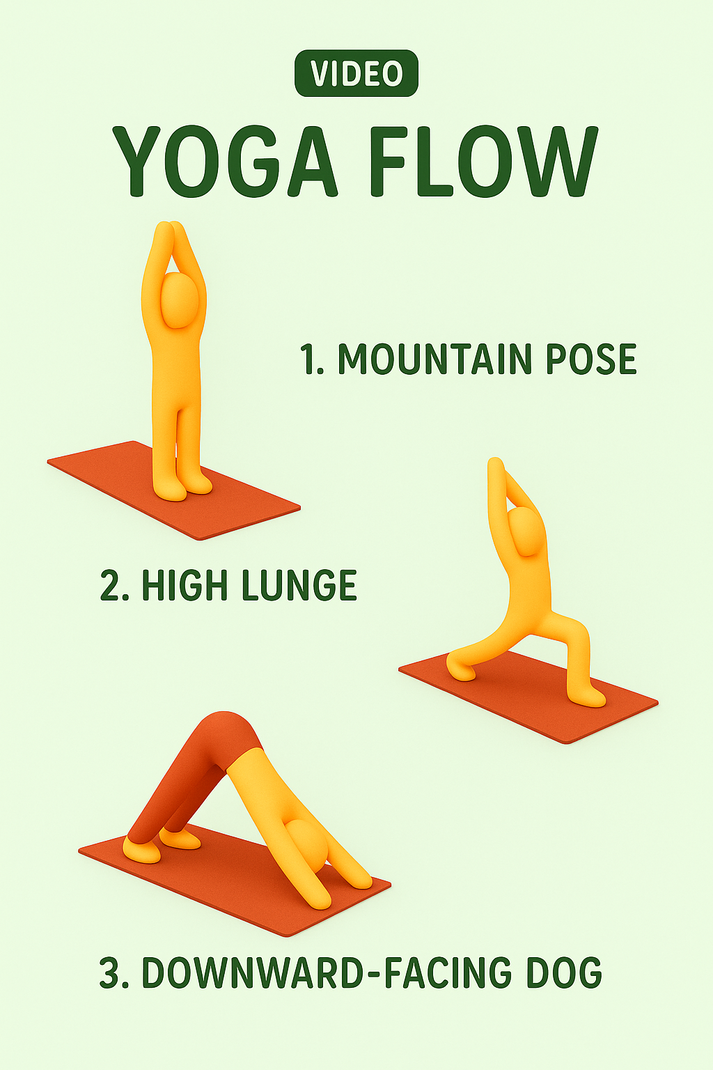 Colorful and engaging infographic illustrating a yoga flow with three poses, designed for fitness enthusiasts and beginners. Ideal for online yoga classes or social media content.