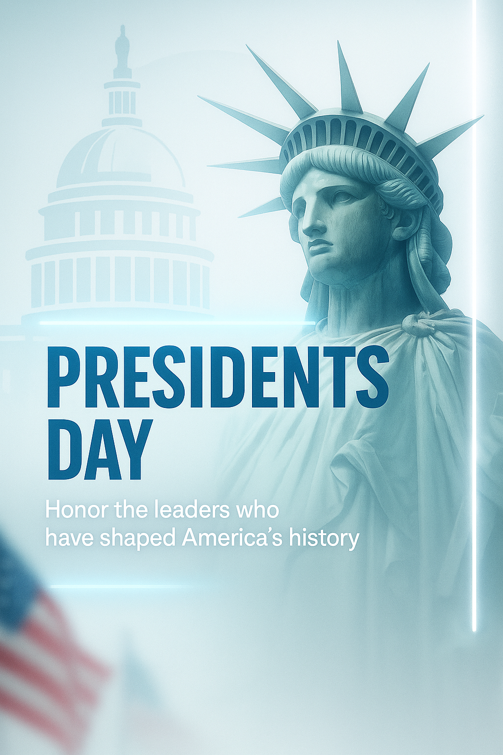/Collection: /by davooda/Type: PNG/Promotional graphic for Presidents Day featuring the Statue of Liberty, designed to honor American leaders. The image utilizes a clean, modern aesthetic suitable for educational or commemorative use.