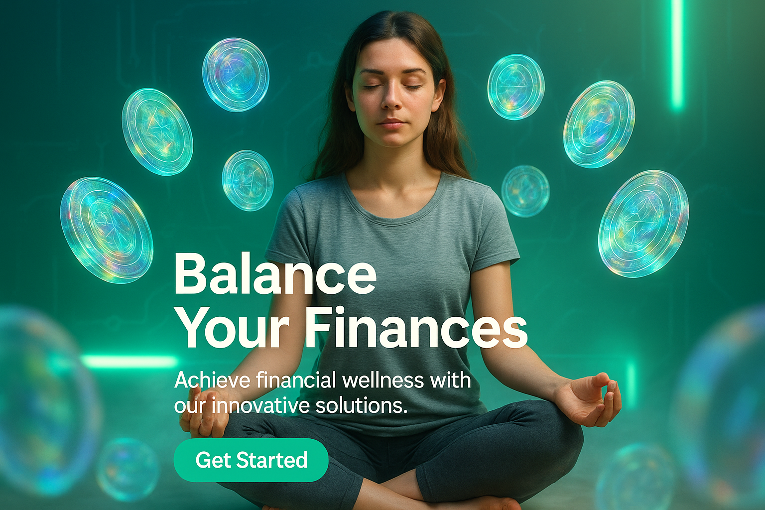 Engaging promotional graphic focused on financial wellness, featuring a meditative figure amidst floating elements. Ideal for marketing financial services.
