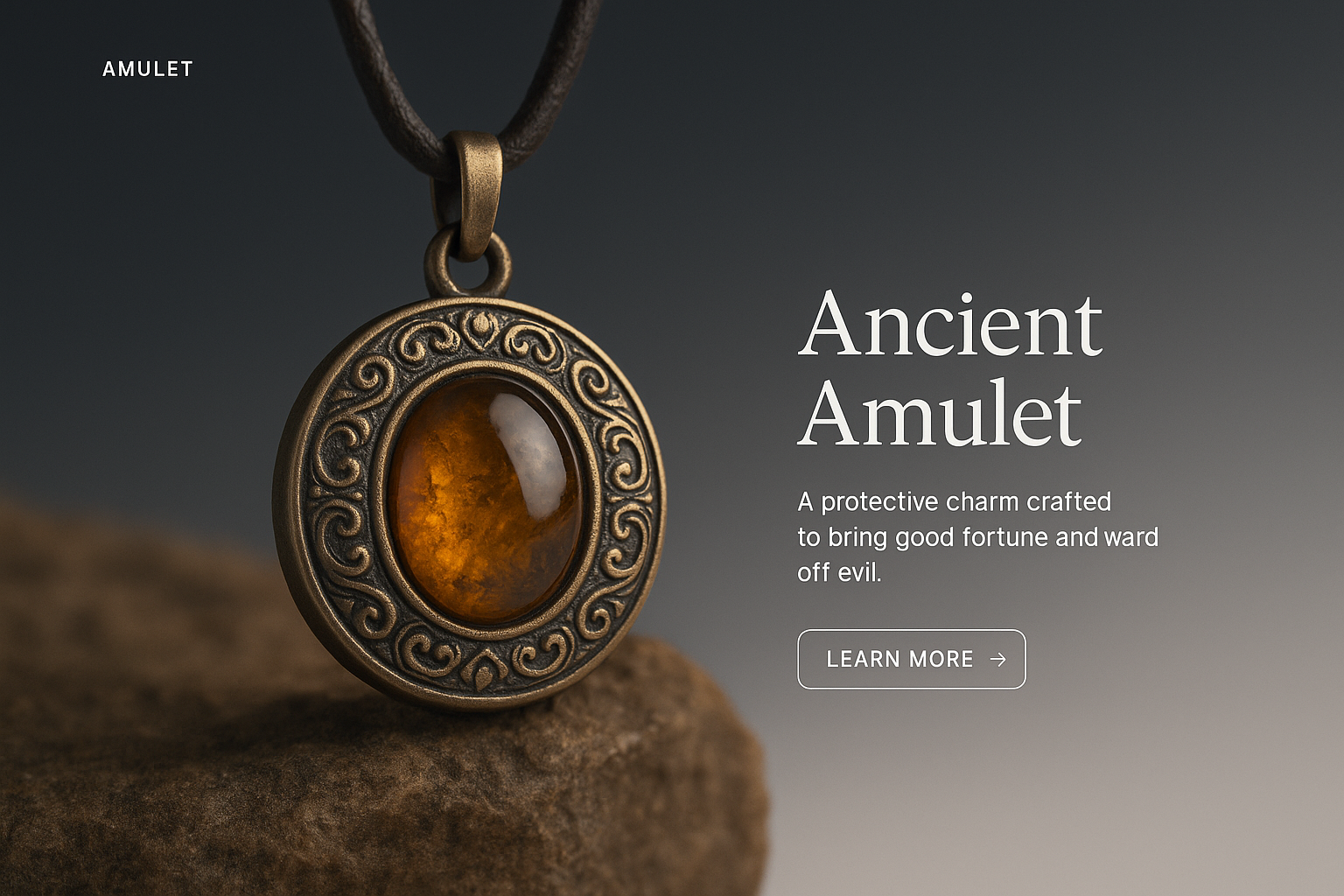 An elegant amulet featuring a unique design, showcasing a warm amber stone. The background includes a smooth gradient transitioning from dark to white, enhancing the amulet's appeal.
