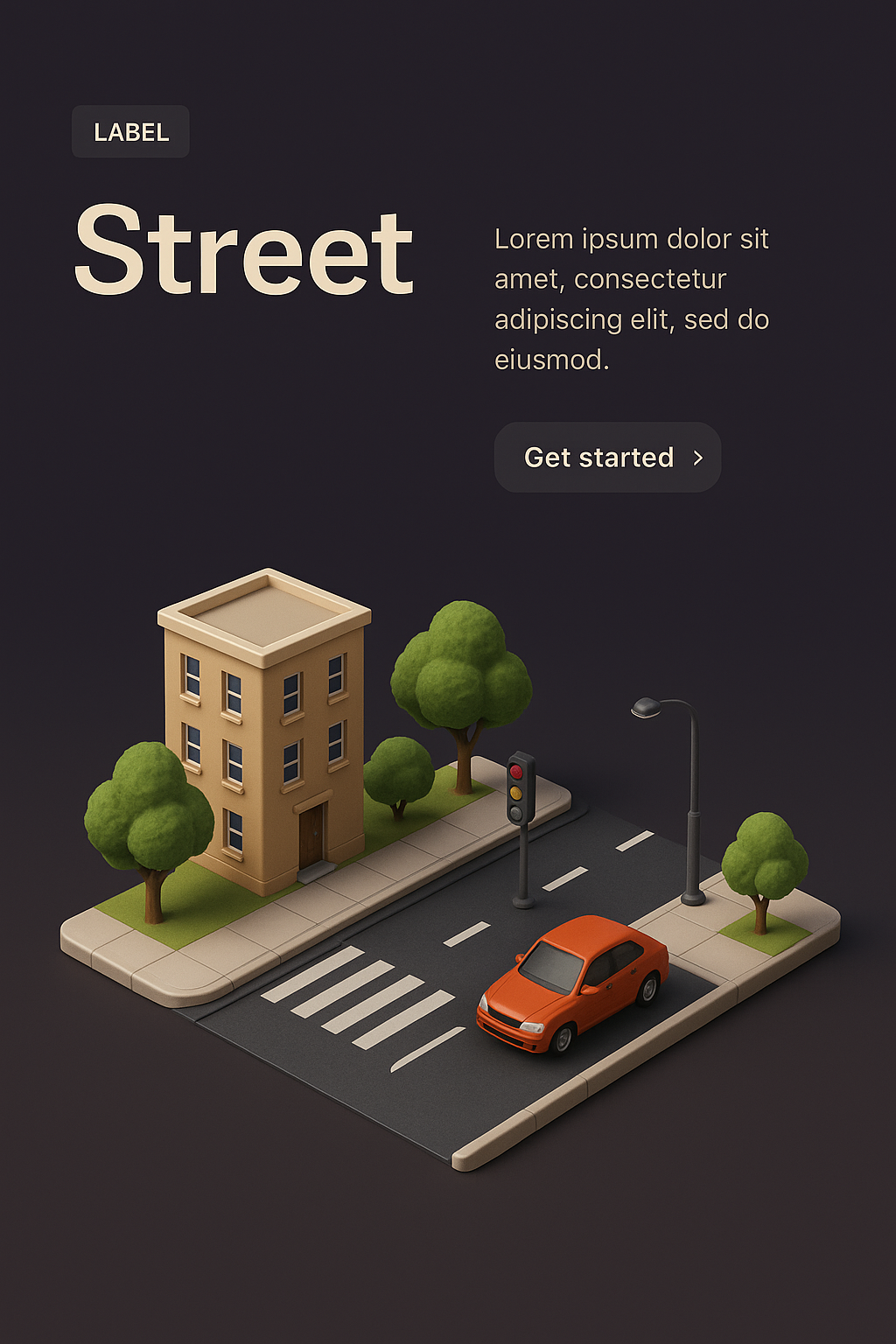 /Collection: /by davooda/Type: PNG/A detailed 3D scene depicting a small street corner with a building, trees, and a car. The design features a dark gradient background and a clean, modern layout.
