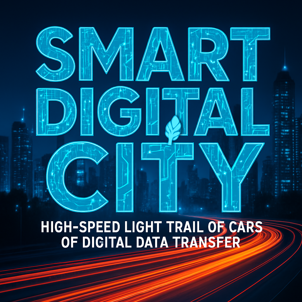 /Collection: /by davooda/Type: PNG/A visually striking graphic showcasing a futuristic smart city concept, featuring vibrant light trails symbolizing digital data transfer. Ideal for tech and urban planning presentations.
