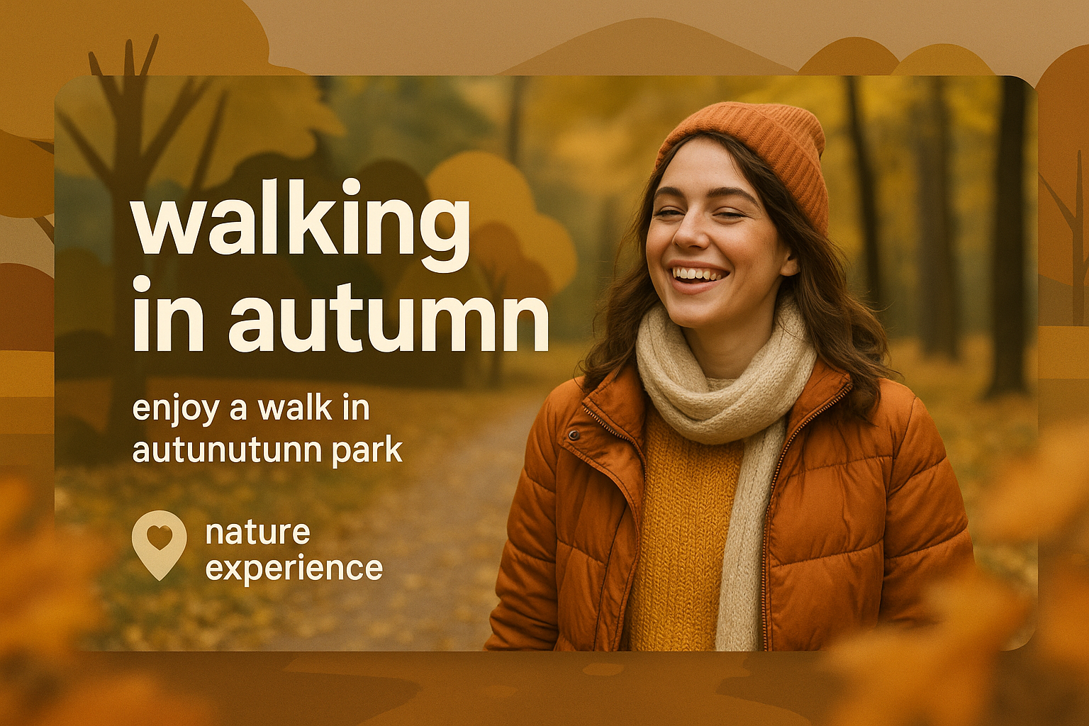 Vibrant promotional graphic inviting nature walks in autumn, featuring a smiling woman in a cozy outfit amidst fall foliage. Ideal for outdoor event marketing.