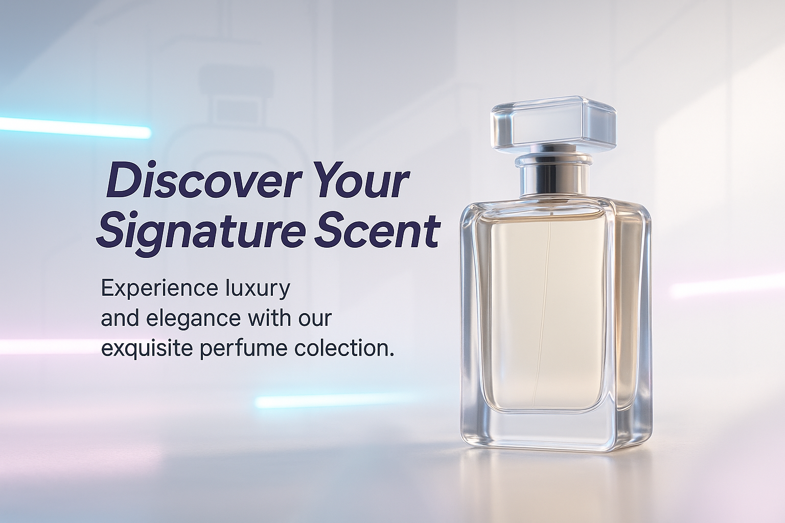 Stylish promotional graphic showcasing a luxury perfume bottle with a modern aesthetic, ideal for advertising a high-end fragrance collection.
