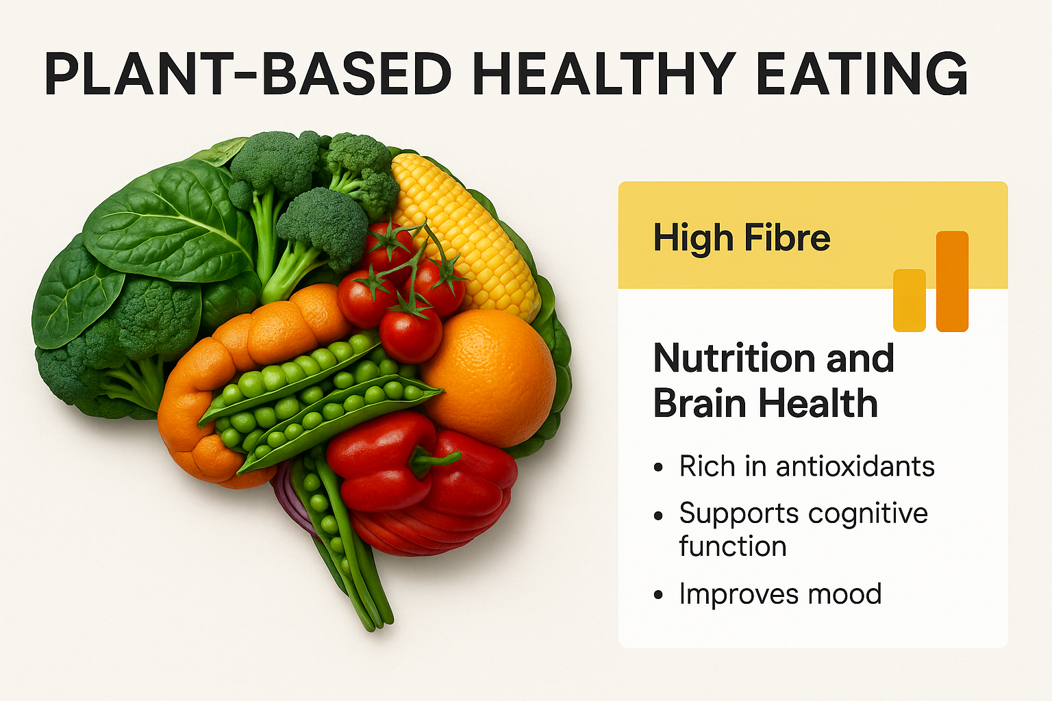 /Collection: /by davooda/Type: PNG/A visually engaging graphic showcasing a brain-shaped arrangement of various fruits and vegetables. It emphasizes the benefits of plant-based eating for nutrition and brain health, featuring a clean and modern design suitable for educational or health-focused content.