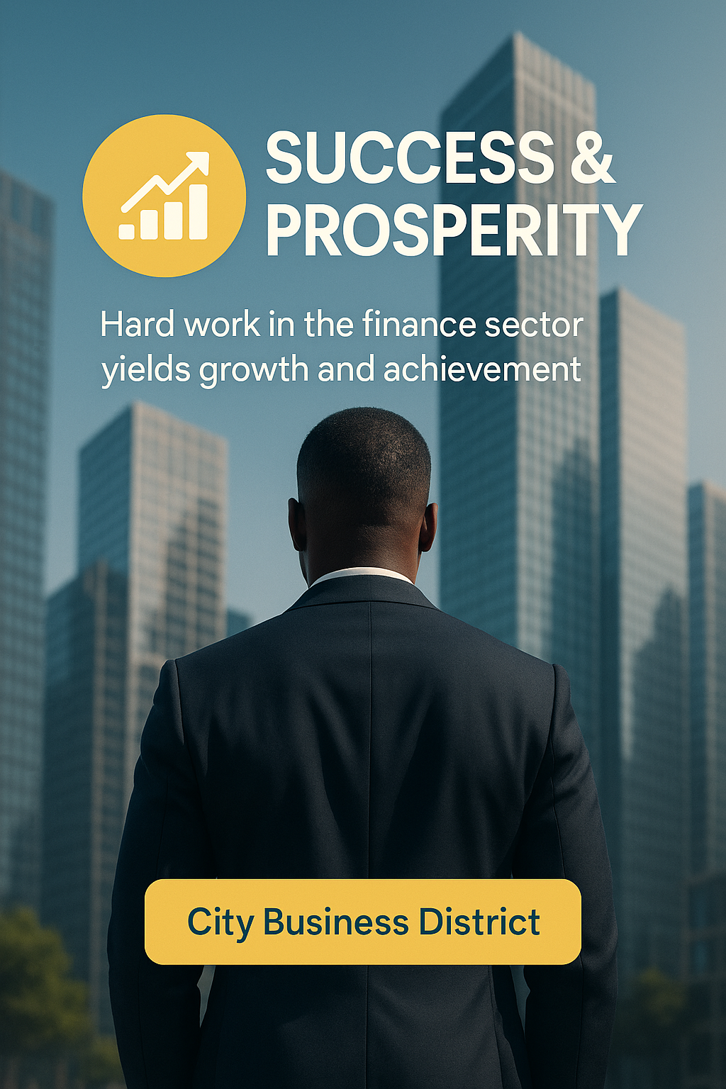 A motivational graphic depicting a professional in a suit looking towards a city skyline, symbolizing growth in the finance sector. Ideal for business-related content and marketing.