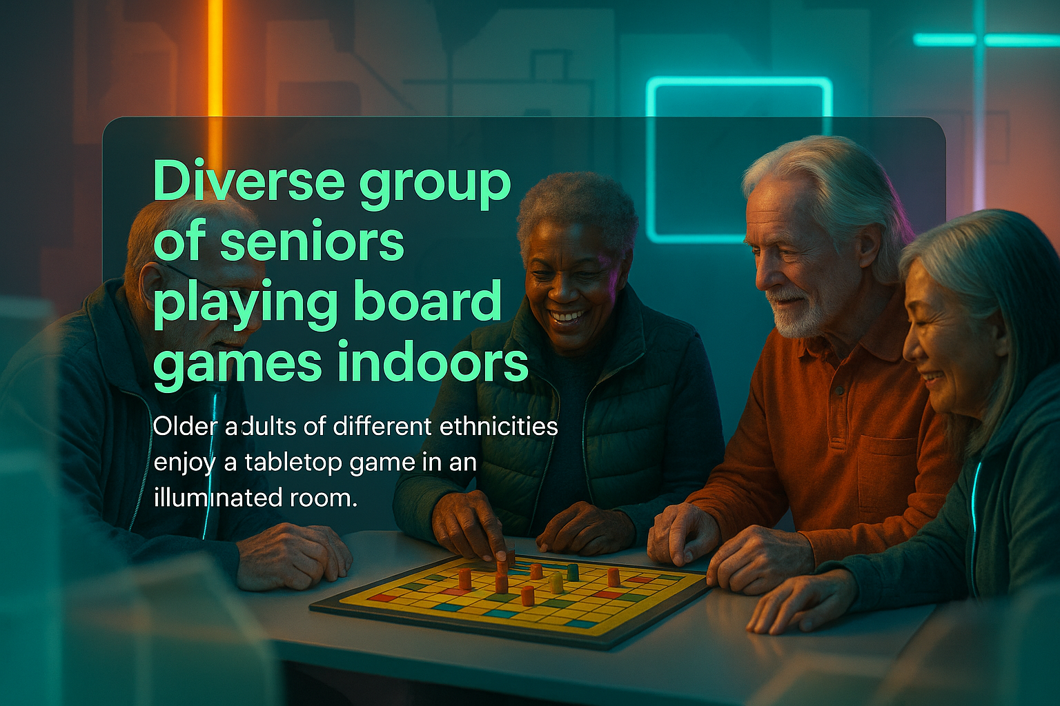 A warm and inviting image showcasing a diverse group of seniors enjoying a board game in a well-lit indoor setting, ideal for community and social engagement themes.