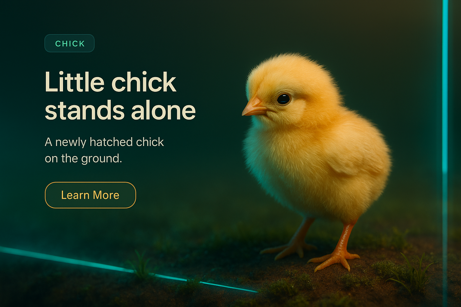 A realistic 3D rendering of a newly hatched chick standing alone against a dark gradient background, accented by glowing neon elements. The composition emphasizes the chick's delicate features.