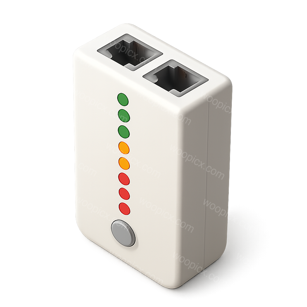 A 3D representation of a cable tester with a sleek design. The icon features indicator lights in green, yellow, and red, set against a transparent background for a modern look.