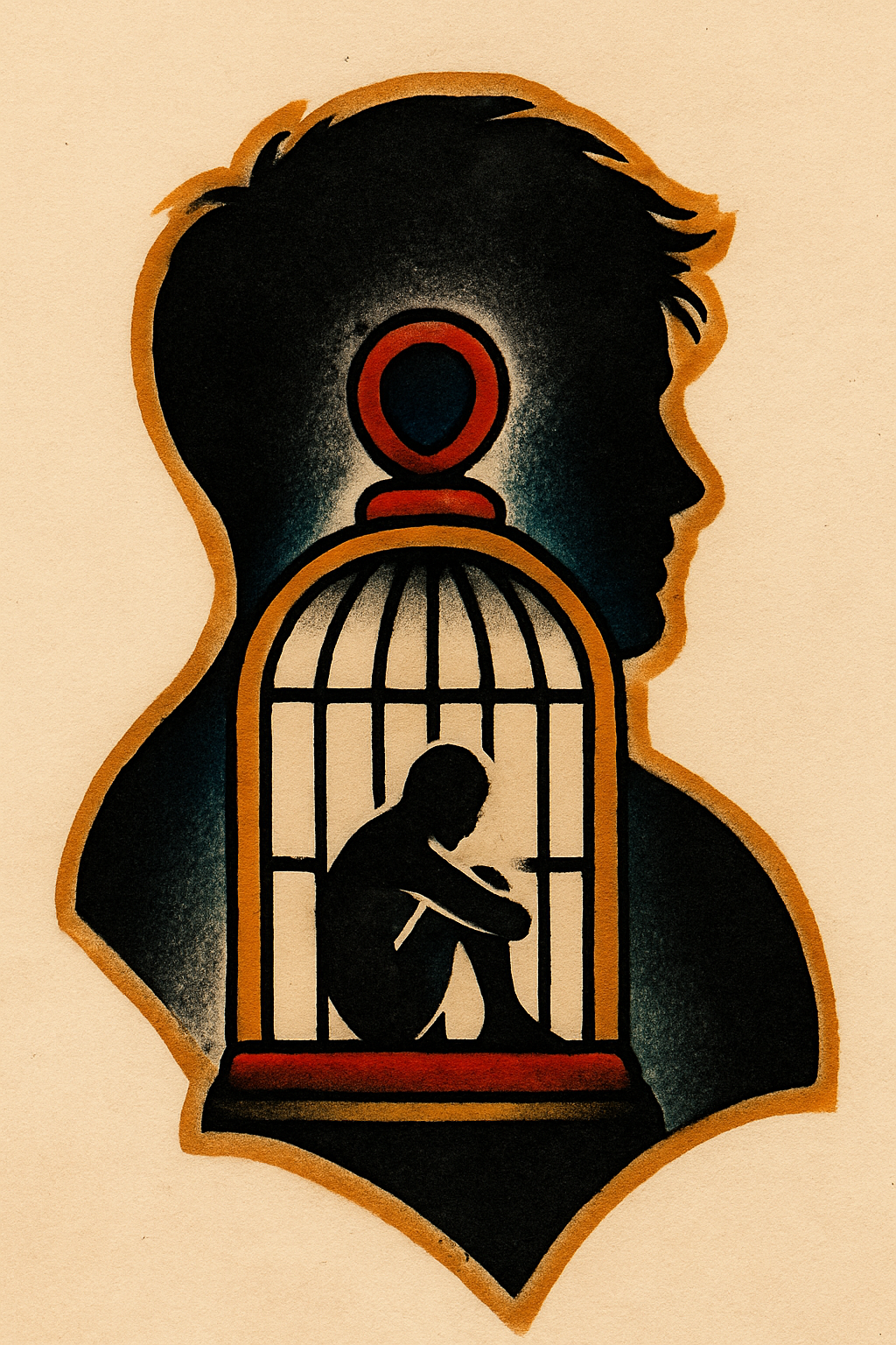 Silhouette with Cage and Figure Tattoo Design
