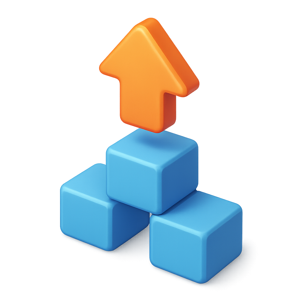 A vibrant 3D icon featuring an orange upward arrow positioned above three blue cubes. The design is isometric with a transparent background, showcasing a modern, volumetric style.