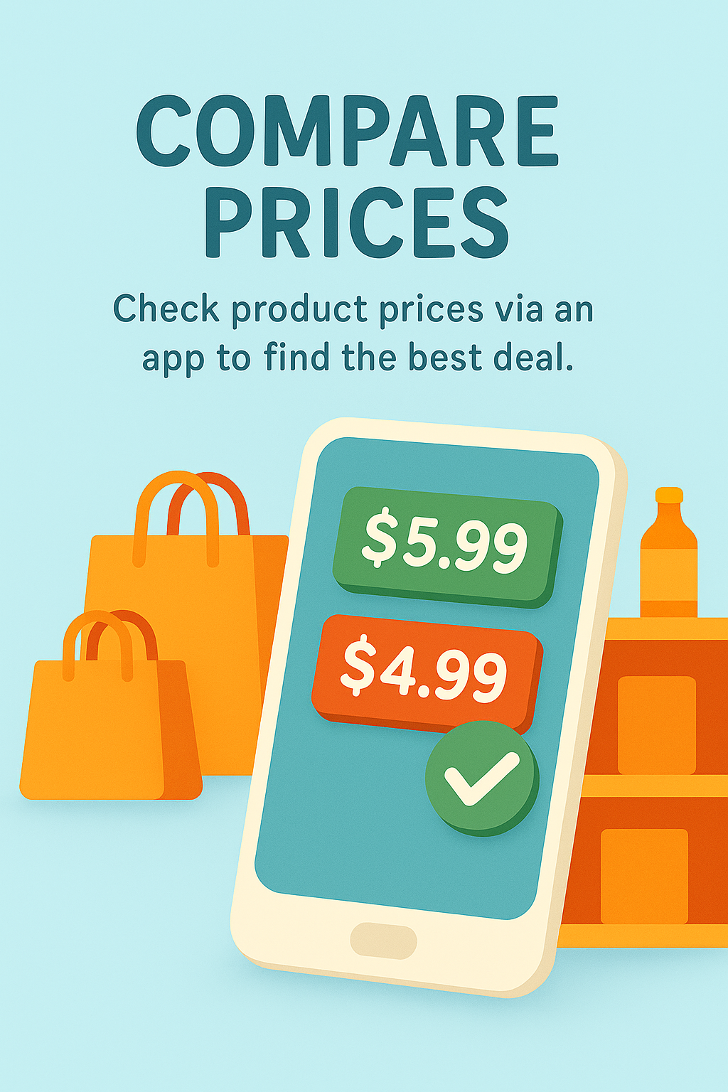 A colorful illustration showcasing a mobile app interface for comparing product prices, ideal for promoting shopping apps or financial services.