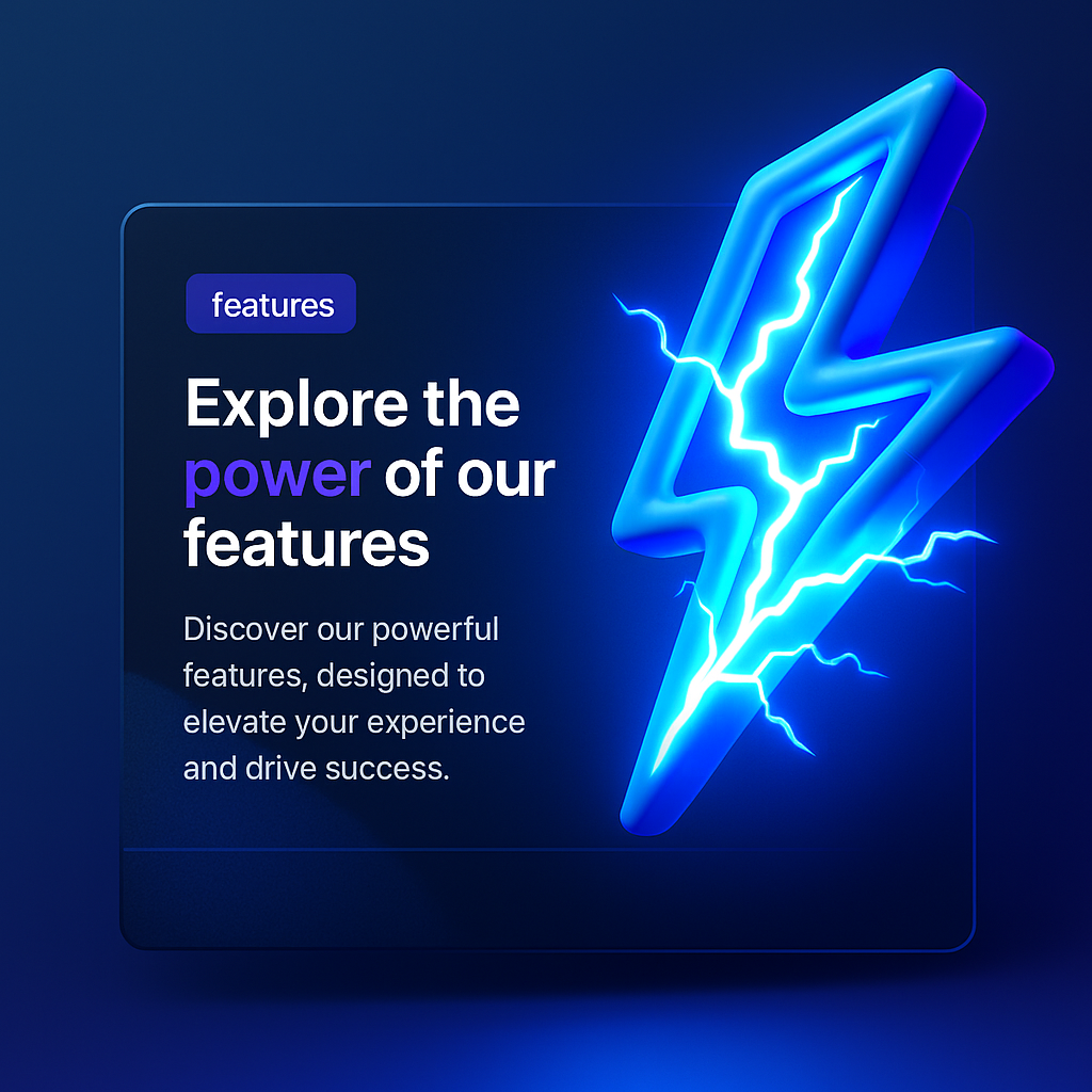 /Collection: /by davooda/Type: PNG/A striking 3D rendering of a lightning bolt integrated into a modern web design feature block. The design includes a gradient background and highlighted text elements.