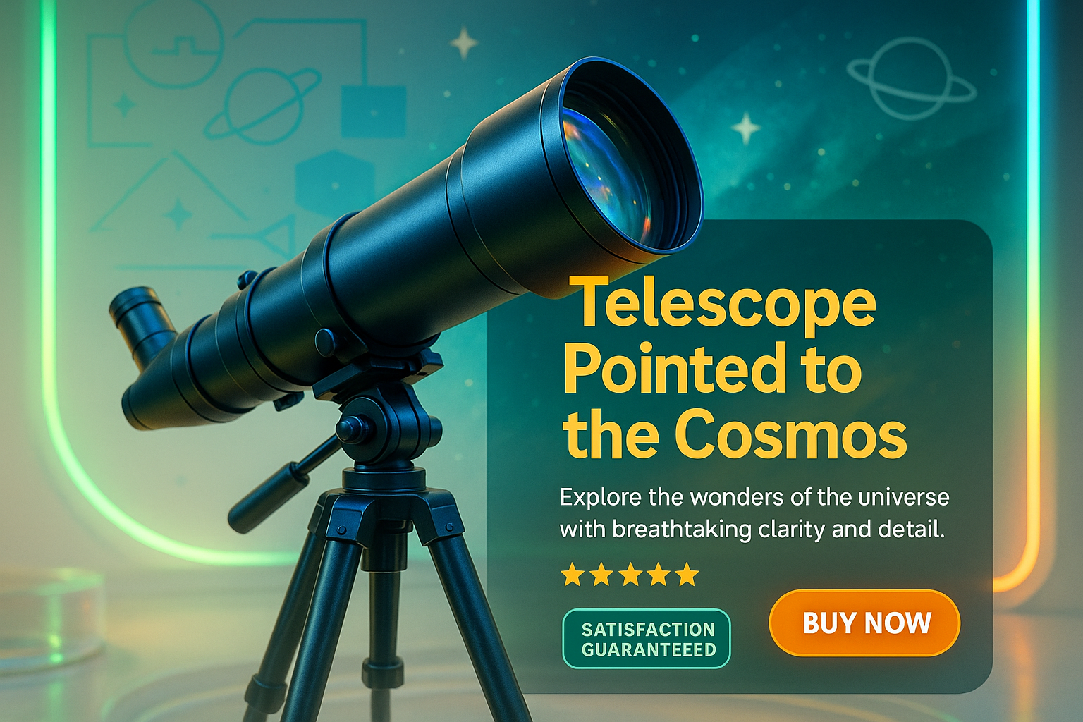 Engaging promotional graphic featuring a telescope aimed at the cosmos, designed to attract astronomy enthusiasts. Ideal for online retail and advertising.