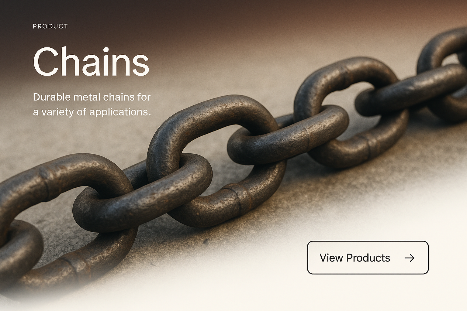 The image features a close-up of durable metal chains against a gradient background, showcasing their texture and design. Text highlights the product's versatility.