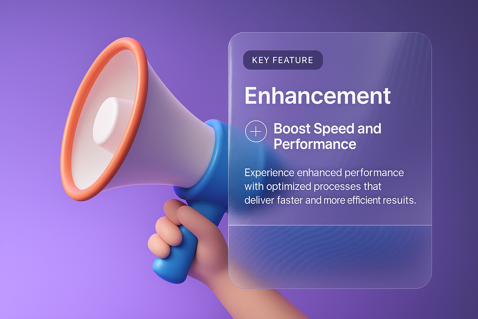 /Collection: /by davooda/Type: PNG/A vibrant 3D illustration featuring a hand holding a megaphone against a smooth gradient background. The design includes a text block highlighting enhancement features.