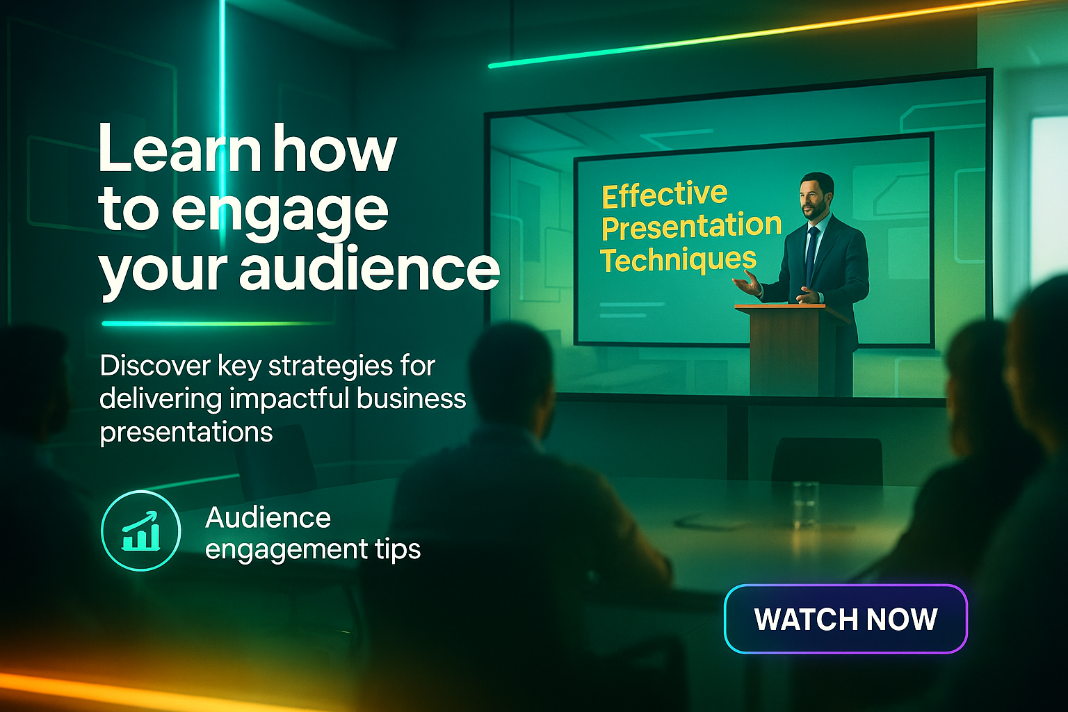 Dynamic promotional graphic showcasing a speaker presenting effective techniques in a modern setting, ideal for business training or webinars.