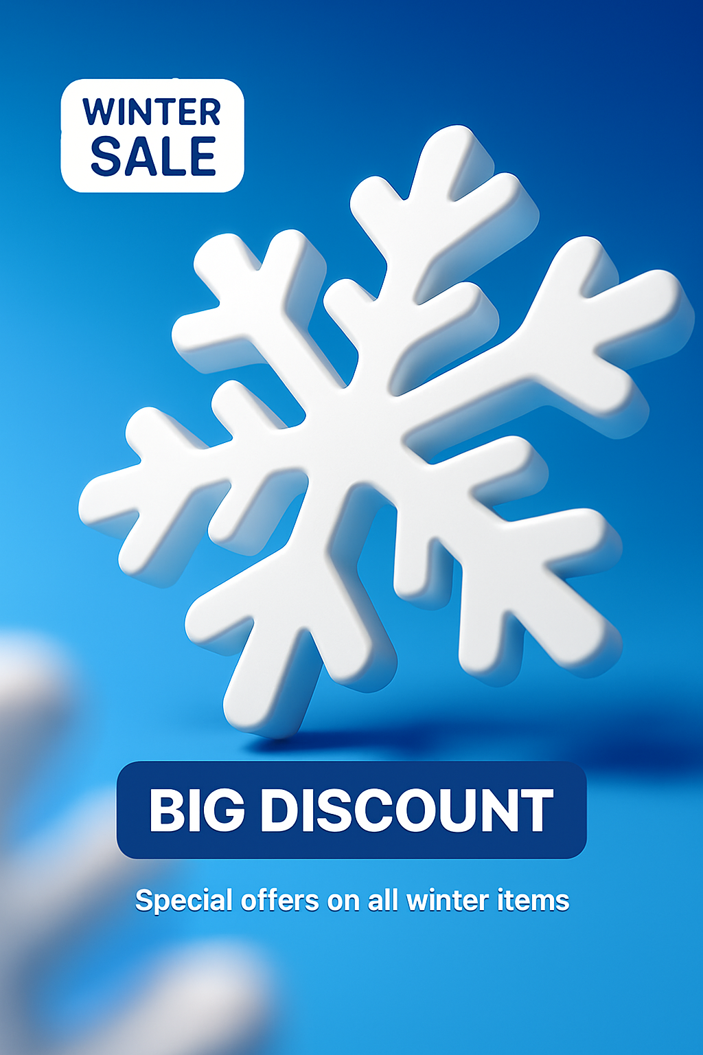 This image features a 3D snowflake against a gradient blue background, designed as a promotional banner for winter sales. It targets shoppers looking for seasonal discounts.
