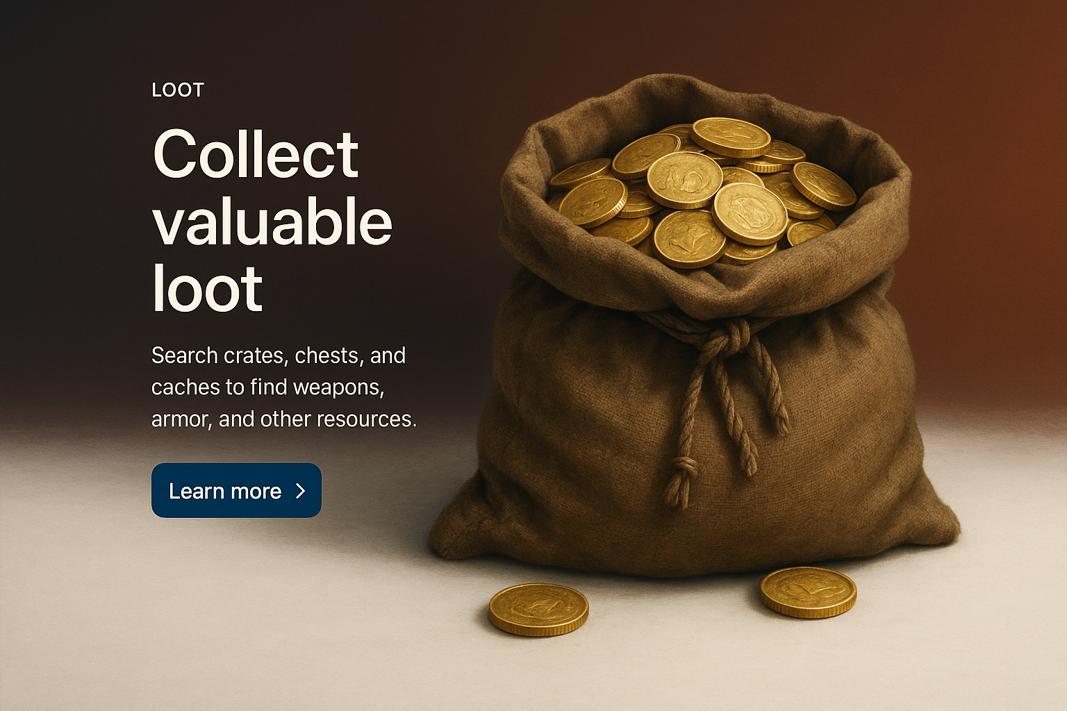 This image features a brown sack overflowing with gold coins, set against a gradient background. The design includes a label and a call-to-action button, suitable for a web page layout.