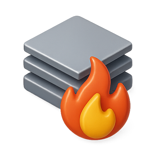 A modern graphic representation of a database icon featuring stacked grey squares and a vibrant flame element, suitable for tech-related applications and branding.