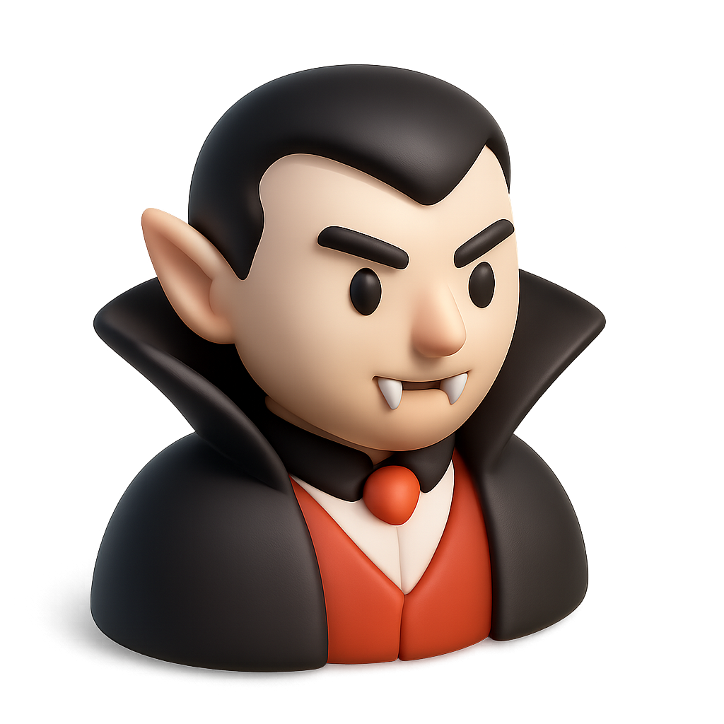 A charming 3D vampire icon presented in a three-quarter view, featuring a glossy finish and isometric design. The vampire has prominent fangs and a classic cape.