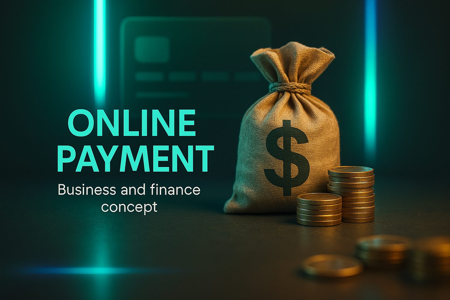 A modern business and finance-themed graphic showcasing a money bag with coins, ideal for digital payment services and financial marketing.