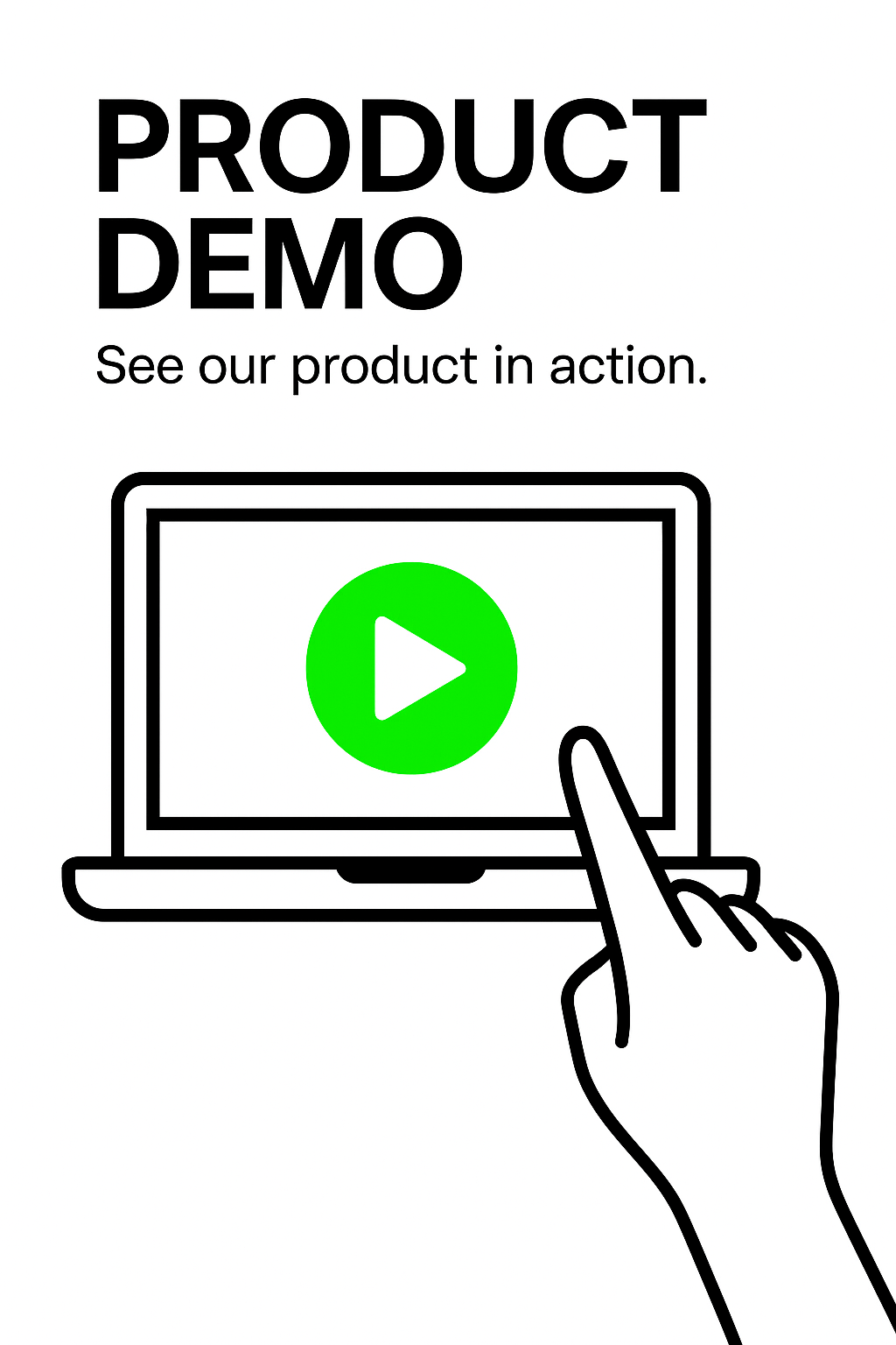 Minimalist graphic showcasing a hand interacting with a laptop, promoting a product demo video. Ideal for tech marketing and online presentations.
