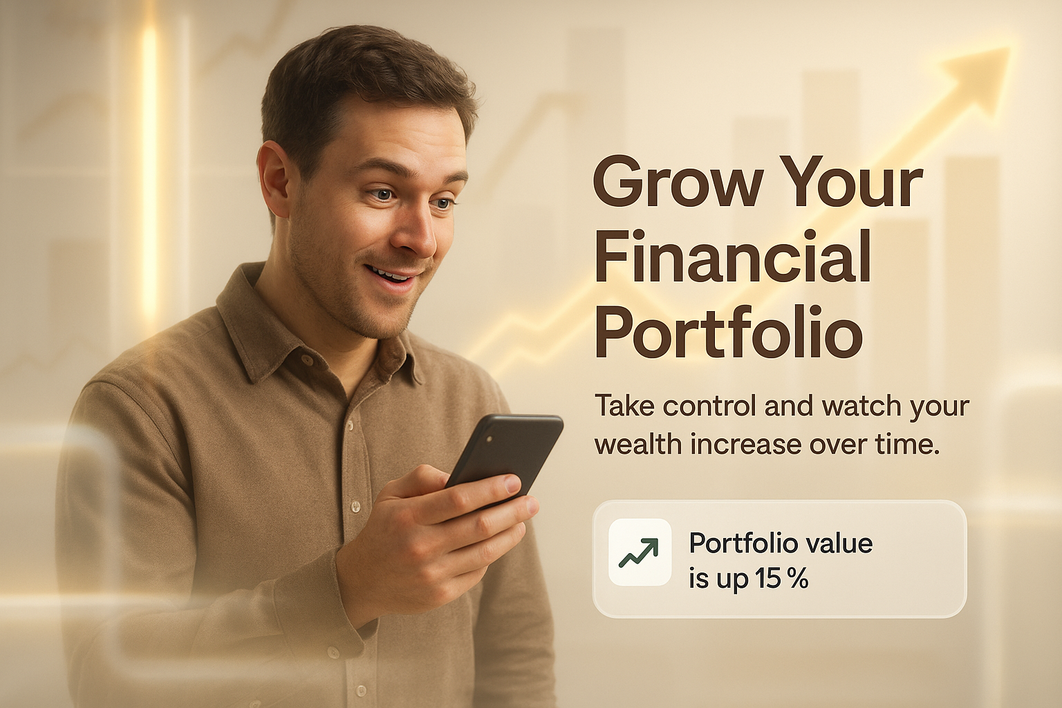 A modern promotional graphic depicting a man engaging with his smartphone, showcasing financial portfolio growth. Ideal for financial services marketing.